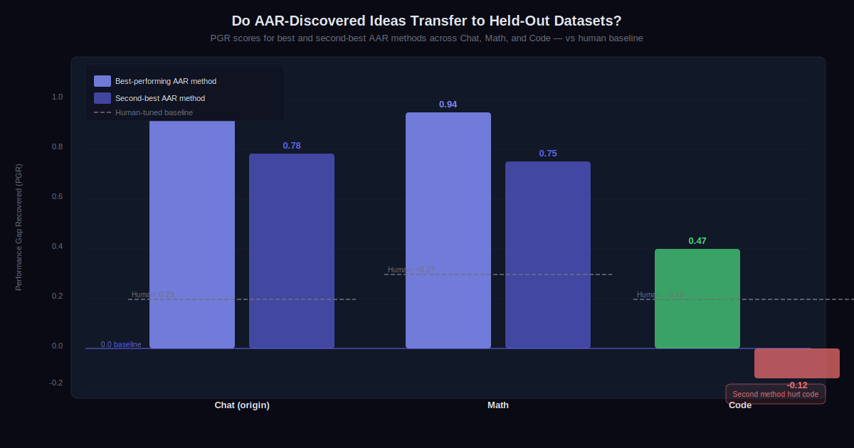 After 800 cumulative hours of research across the nine AARs, the final PGR was 0.97. The top-performing method generalized to held-out datasets: 0.94 on math tasks, 0.47 on coding (still double the human baseline). The second-best method generalized to math (0.75) but hurt performance on code. Not every idea transferred, but the best one did.