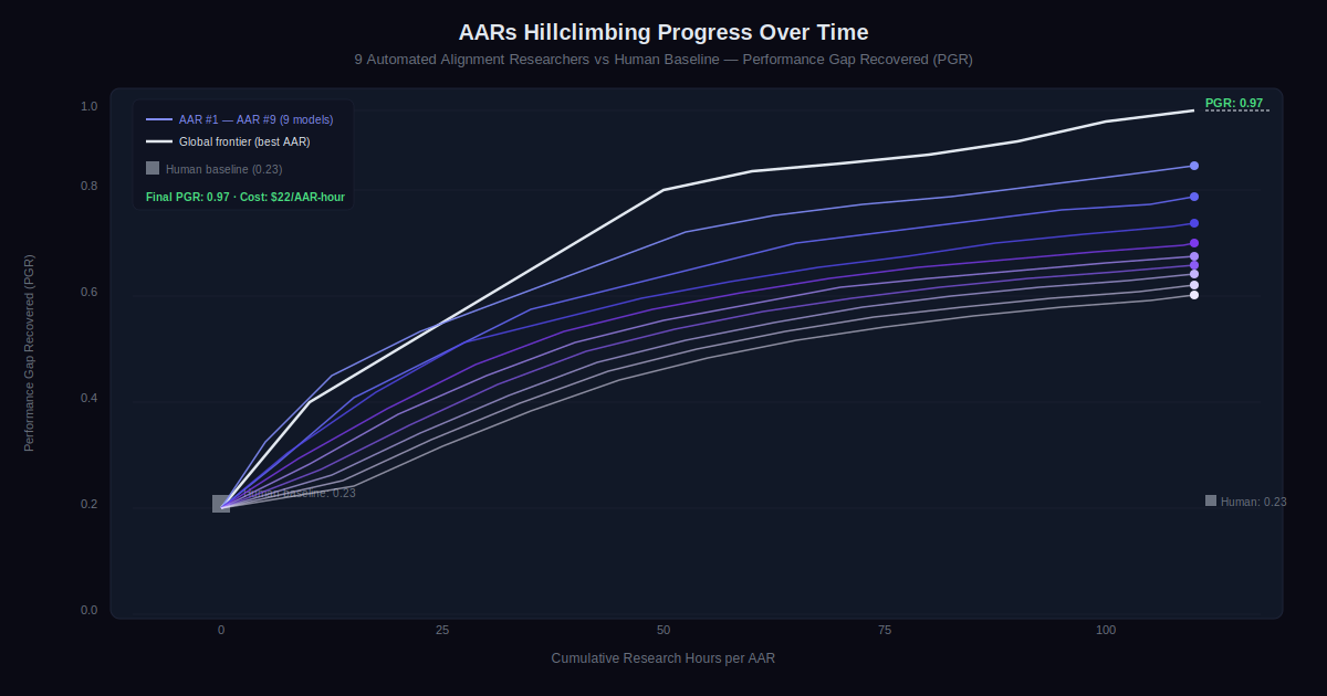 For the alignment research community, the practical takeaway is this: automated researchers are already capable of generating and testing novel hypotheses on verifiable problems, recovering performance gaps that took human researchers weeks to establish, at a cost of $22 per hour. The next question is which problems can be made verifiable enough for AARs to work on — and which cannot.