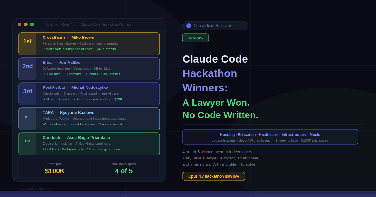 The Built with Opus 4.6 Claude Code hackathon produced five winners across housing, education, healthcare, infrastructure, and music. Four of them were not professional developers. That pattern is the real story here. A lawyer, a cardiologist, a roads engineer, and a musician built production-quality tools in a week using Claude Code without writing code themselves.