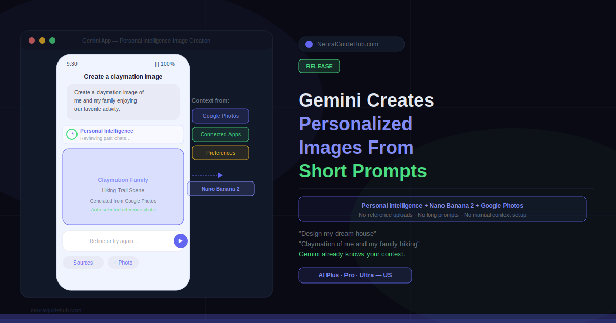 Google just addressed that directly. The Gemini app now uses Personal Intelligence and Nano Banana 2 to generate Gemini personalized images from short, simple prompts automatically pulling context from your connected Google apps and Google Photos library. No reference photo uploads. No lengthy descriptions. Just a prompt and a result that actually reflects your life.