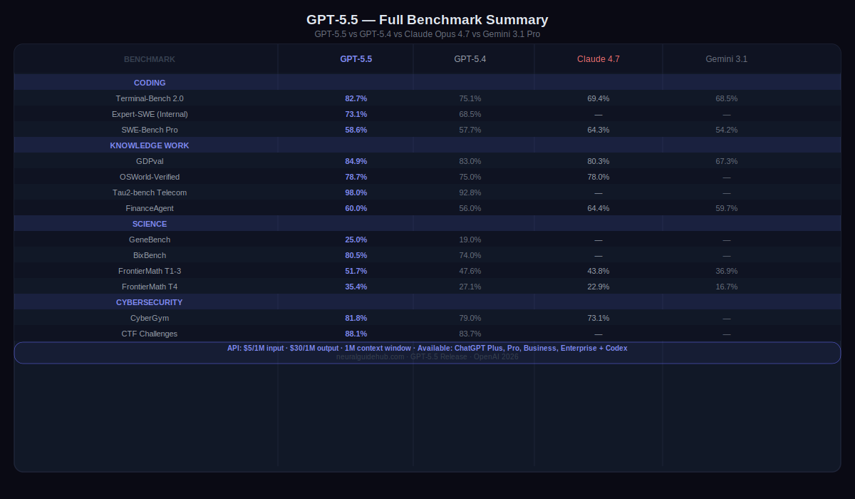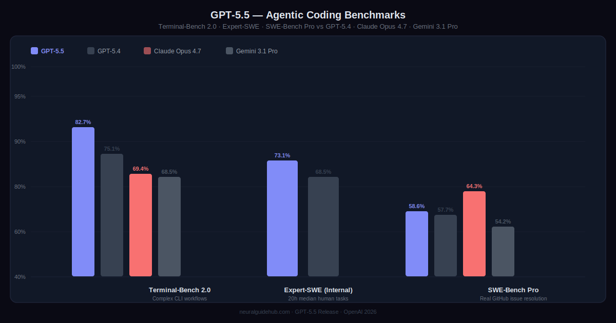 Terminal-Bench 2.0 is the benchmark I pay attention to for agentic coding. It tests complex command-line workflows — the kind that require planning ahead, adjusting based on partial results, coordinating multiple tools, and not giving up when something breaks halfway through. GPT-5.5 scores 82.7% on it. GPT-5.4 scored 75.1%. Claude Opus 4.7 scored 69.4%.