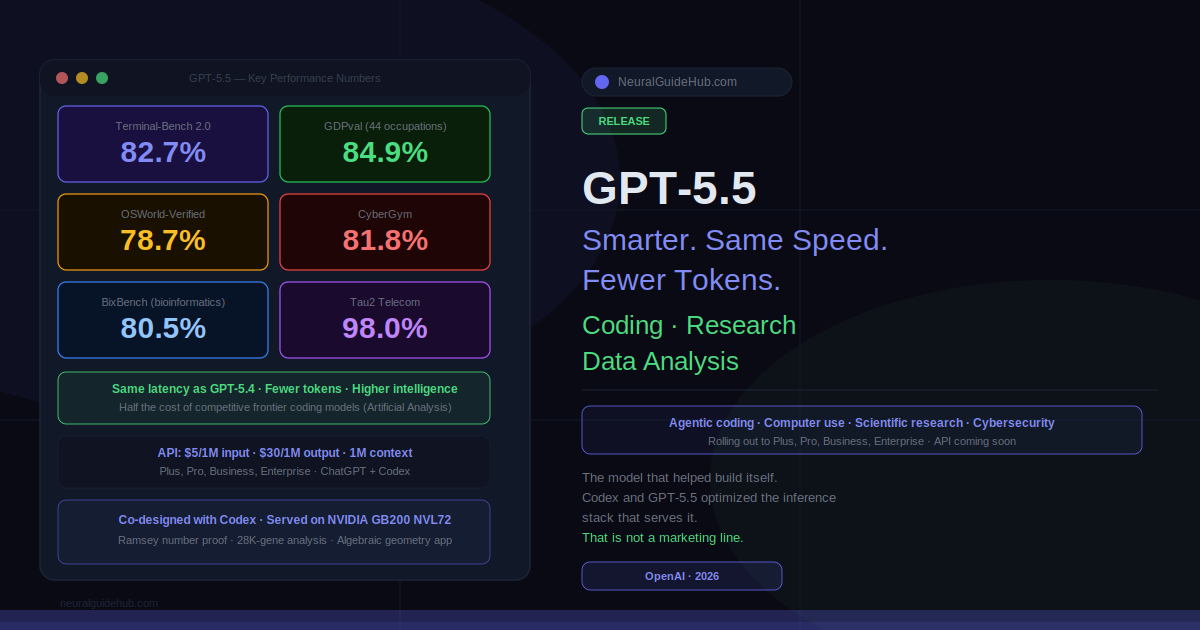 GPT-5.5 is OpenAI’s new flagship model, built specifically for agentic work. Not just writing code. Planning, using tools, checking its own output, navigating through ambiguous failures, and continuing until the task is actually done. The other technical claim worth noting: it matches GPT-5.4’s per-token latency in production. Bigger, smarter models are almost always slower. Getting there without a speed penalty required rethinking how inference works, and they did it partly by having GPT-5.5 and Codex optimize the infrastructure stack themselves.