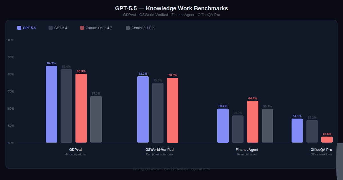 OpenAI’s GDPval benchmark covers 44 different occupations and tests whether an agent can produce professional-quality work across that range. GPT-5.5 scores 84.9%. That’s across accountants, analysts, marketing roles, legal work, and more. On OSWorld-Verified, which tests whether the model can actually operate a real computer by seeing a screen, clicking, typing, and navigating interfaces, it scores 78.7%.