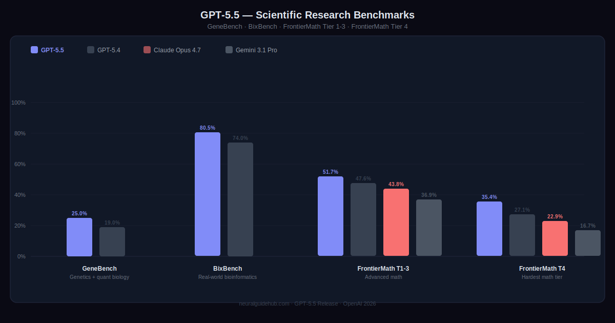 GeneBench measures multi-stage scientific data analysis in genetics and quantitative biology. Problems where the model has to work through ambiguous or errorful data with minimal guidance, handle hidden confounders and QC failures, and apply modern statistical methods correctly. GPT-5.5 scores 25.0%. GPT-5.4 scored 19.0%. On BixBench, real-world bioinformatics tasks, GPT-5.5 reaches 80.5% versus GPT-5.4’s 74.0%.