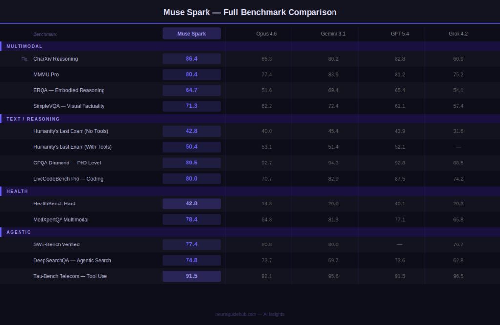 Muse Spark is natively multimodal from the ground up – not a text model with vision bolted on. It supports tool-use, visual chain of thought, and multi-agent orchestration. The table below shows how it compares against Opus 4.6, Gemini 3.1 Pro, GPT 5.4, and Grok 4.2 across multimodal, reasoning, health, and agentic tasks.
