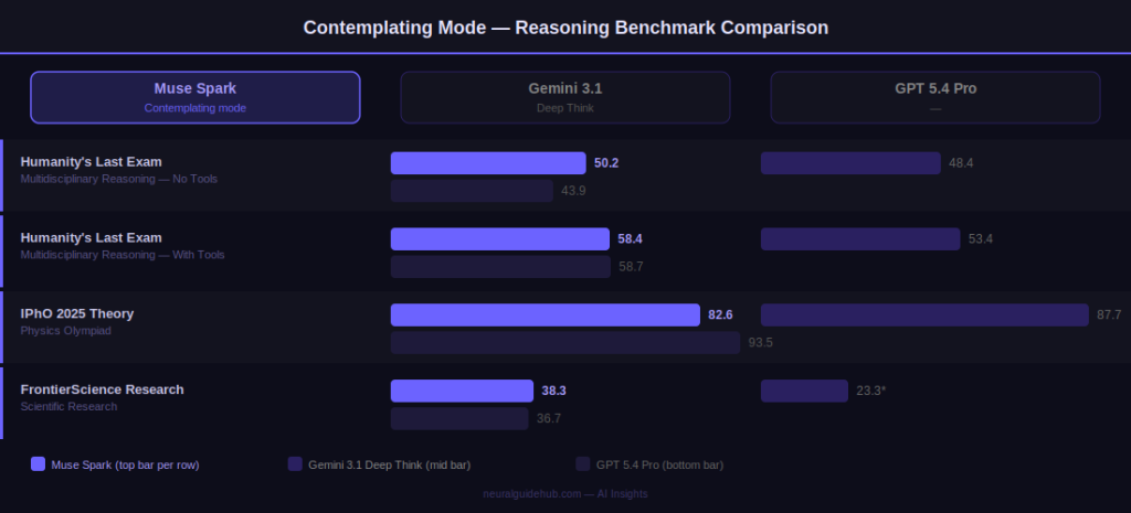 Alongside the base model, Meta is releasing Contemplating mode – a reasoning mode that orchestrates multiple agents working in parallel rather than a single agent thinking longer. This is designed to compete directly with Gemini Deep Think and GPT Pro on hard reasoning tasks.