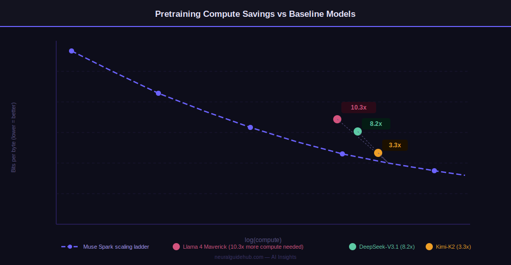 Over nine months, Meta rebuilt its pretraining stack – model architecture, optimization, and data curation all changed. The result: Muse Spark reaches the same capability level as Llama 4 Maverick with over an order of magnitude less compute.