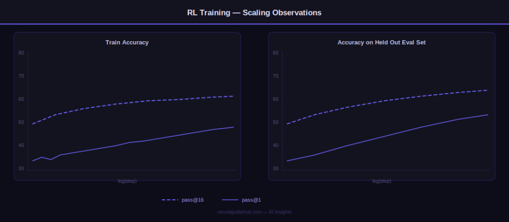 After pretraining, RL amplifies capabilities at scale. Large-scale RL is notoriously unstable, but Meta’s new stack delivers smooth, predictable gains. Training plots show log-linear growth in both pass@1 and pass@16 – meaning the model improves reliability without losing reasoning diversity. Gains generalize cleanly to held-out tasks not seen during training.