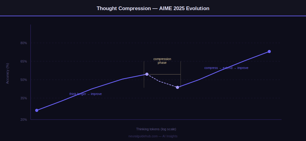The thinking time penalty produces an effect Meta calls thought compression. After an initial period where the model improves by thinking longer, the penalty forces it to compress its reasoning – solving problems with significantly fewer tokens. After compression, performance rises again as the model extends solutions from a more efficient base.