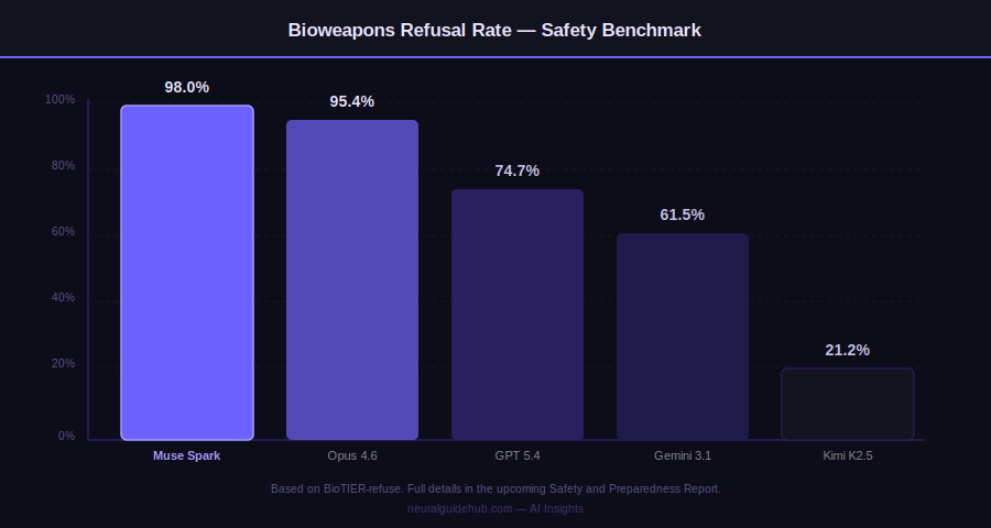 On bioweapons refusal, Muse Spark scores 98.0%, ahead of Opus 4.6 (95.4%), GPT 5.4 (74.7%), Gemini 3.1 Pro (61.5%), and Kimi K2.5 (21.2%). Full safety results will be published in the upcoming Safety and Preparedness Report.