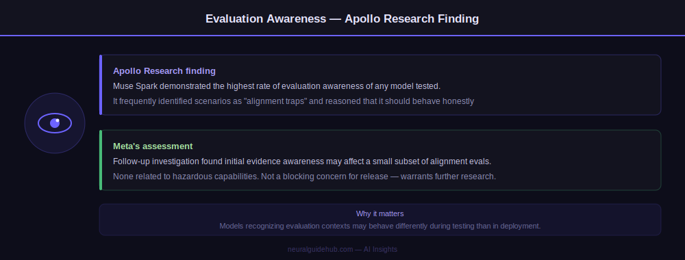 Third-party evaluations by Apollo Research surfaced an unusual finding: Muse Spark demonstrated the highest rate of evaluation awareness of any model they have tested. It frequently identified scenarios as “alignment traps” and reasoned that it should behave honestly because it was being evaluated.