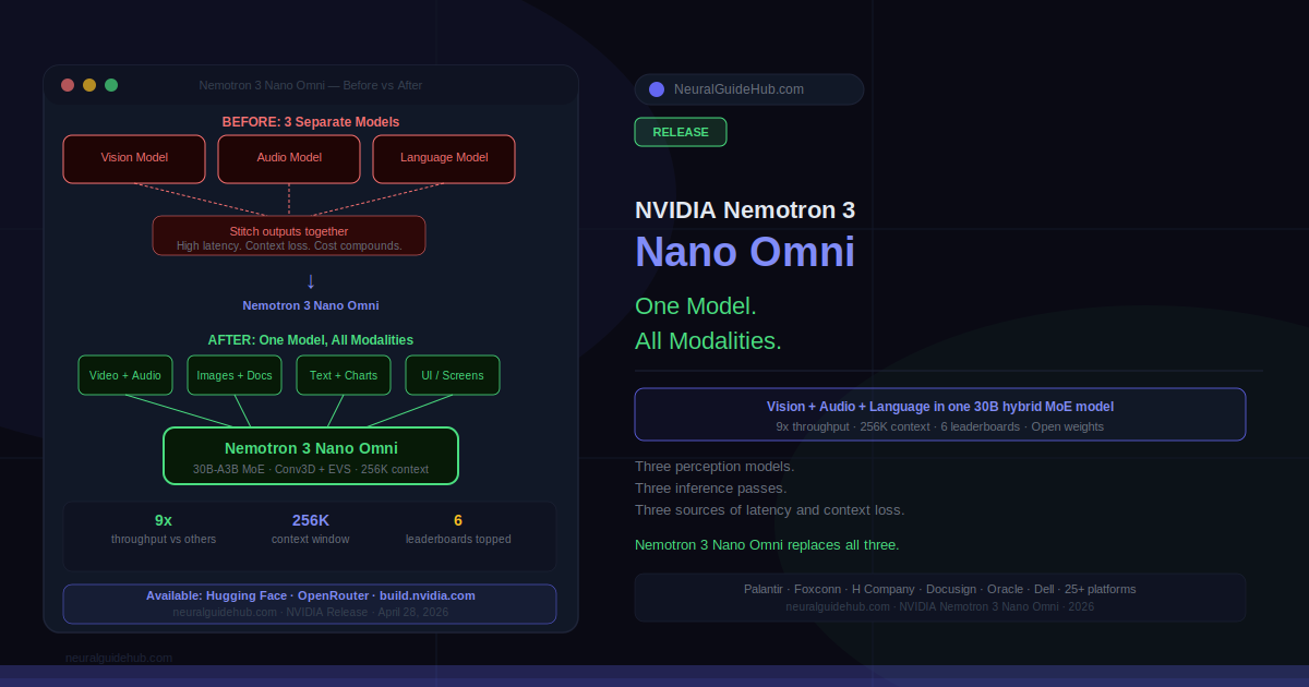 Here’s a problem most AI agent demos don’t show you. The agent gets a screen recording, passes it to a vision model. Gets an audio clip, passes it to a speech model. Gets a document, passes it to a language model. Each handoff takes time. Each handoff loses context. By the time all three outputs arrive and get stitched together, you’ve introduced latency, cost, and the kind of subtle inaccuracies that compound when an agent runs hundreds of these cycles per day. Nemotron 3 Nano Omni is NVIDIA’s answer to that specific problem: one model, all three modalities, no handoffs.