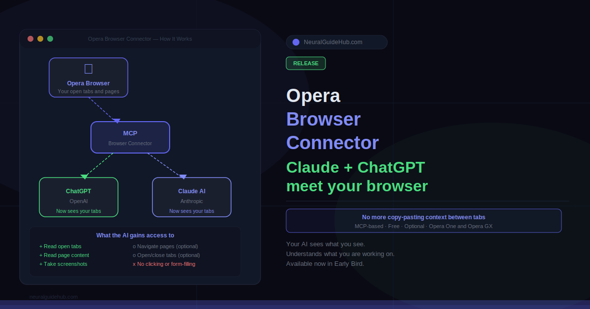 Opera just shipped a free fix for that. Opera Browser Connector, now available in Early Bird for Opera One and Opera GX, connects Claude or ChatGPT directly to your live browser session via Model Context Protocol (MCP). The AI can read your open tabs, take screenshots, navigate to pages, and understand what you are actually working on — without you manually feeding it any of that context.