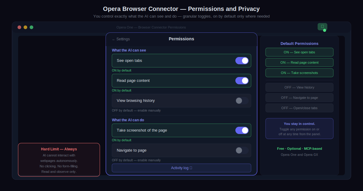 By default, the connected AI can read your open tabs and read tab content. It can also take screenshots of tabs. These three capabilities are on by default because they are the core of what makes the feature useful.