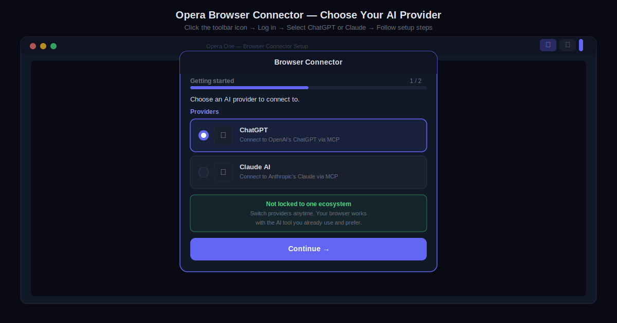 After installation, click the Browser Connector icon in your toolbar. You will be prompted to log in with your Opera account or create one. From there, choose your AI provider — ChatGPT or Claude — and follow the setup steps for whichever you pick.