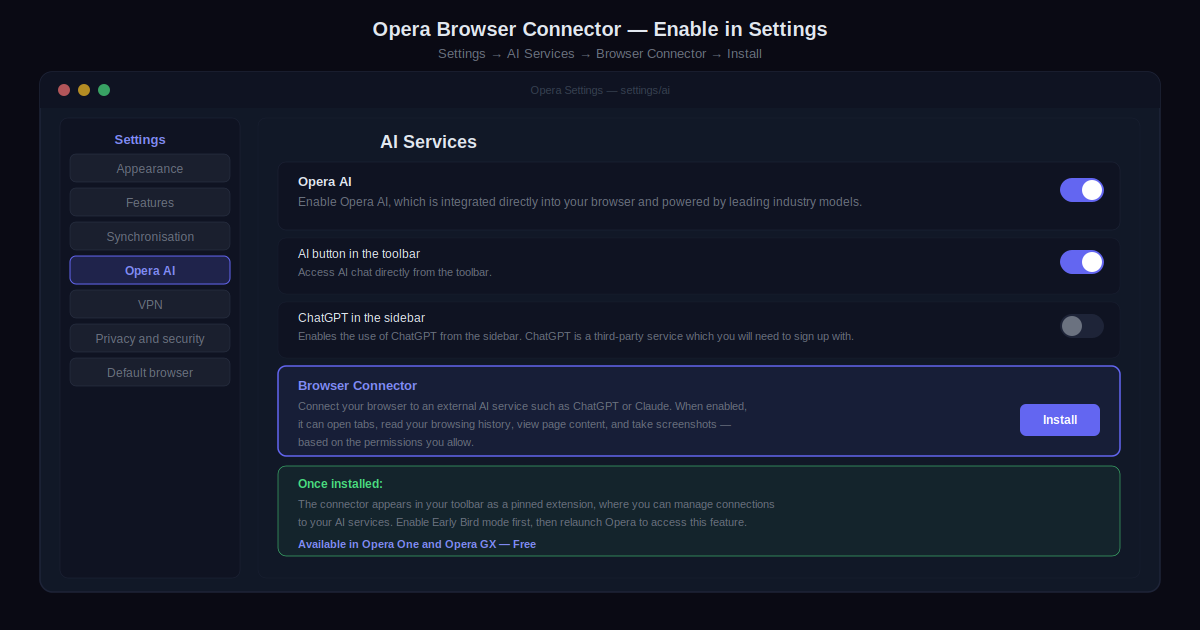 Opera browser settings → search for “AI Services” → find Browser Connector → click Install.