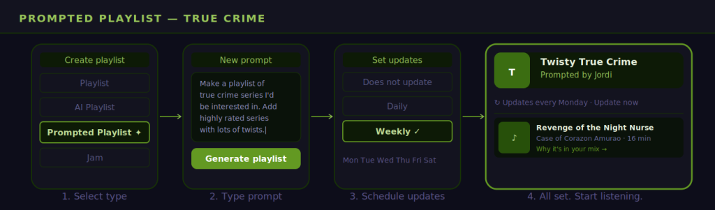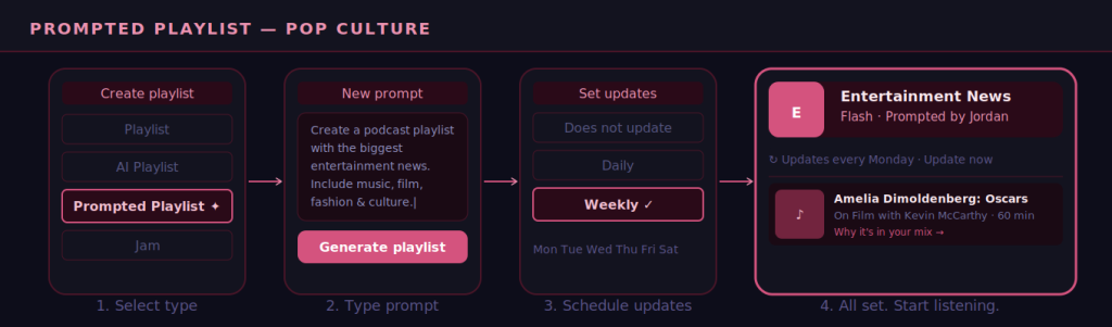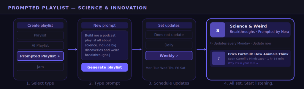 The result is not just a generic recommendation list. Each episode or track in the playlist includes a short note explaining why it landed in your mix. You can edit the prompt at any time, regenerate the playlist entirely, or set it to update automatically on a daily or weekly schedule.