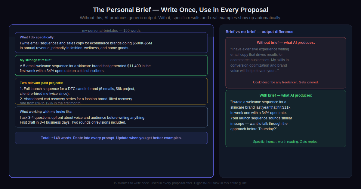 - Skipping the personal brief. Without it, AI generates generic freelancer language because it has nothing specific to draw from. Writing the brief takes 15 minutes. It gets used in every proposal after that. It’s the single highest-ROI task in this entire guide.