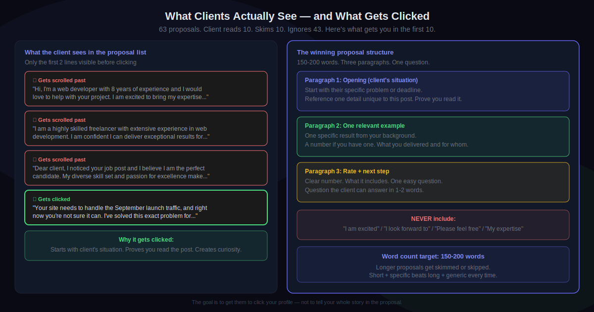The client I mentioned at the start, the one who gets 63 proposals and reads 10? She hired a freelancer last month who sent a 160-word proposal that opened with a sentence directly about her launch deadline. She replied within four hours. The other 62 people are still wondering why they don’t get replies.