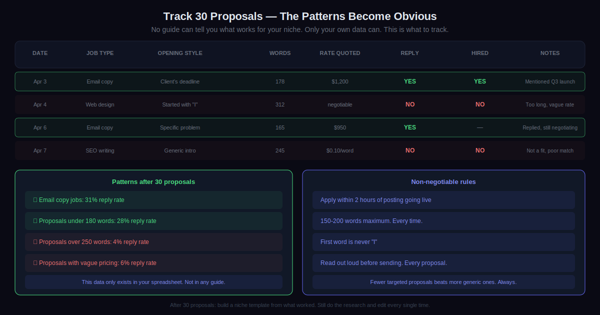 - Track everything for 30 proposals. Which job types reply. Which openings get clicked. Which rate ranges work. No guide can tell you this for your niche. Only your own data can. Thirty proposals gives you enough to see patterns clearly.