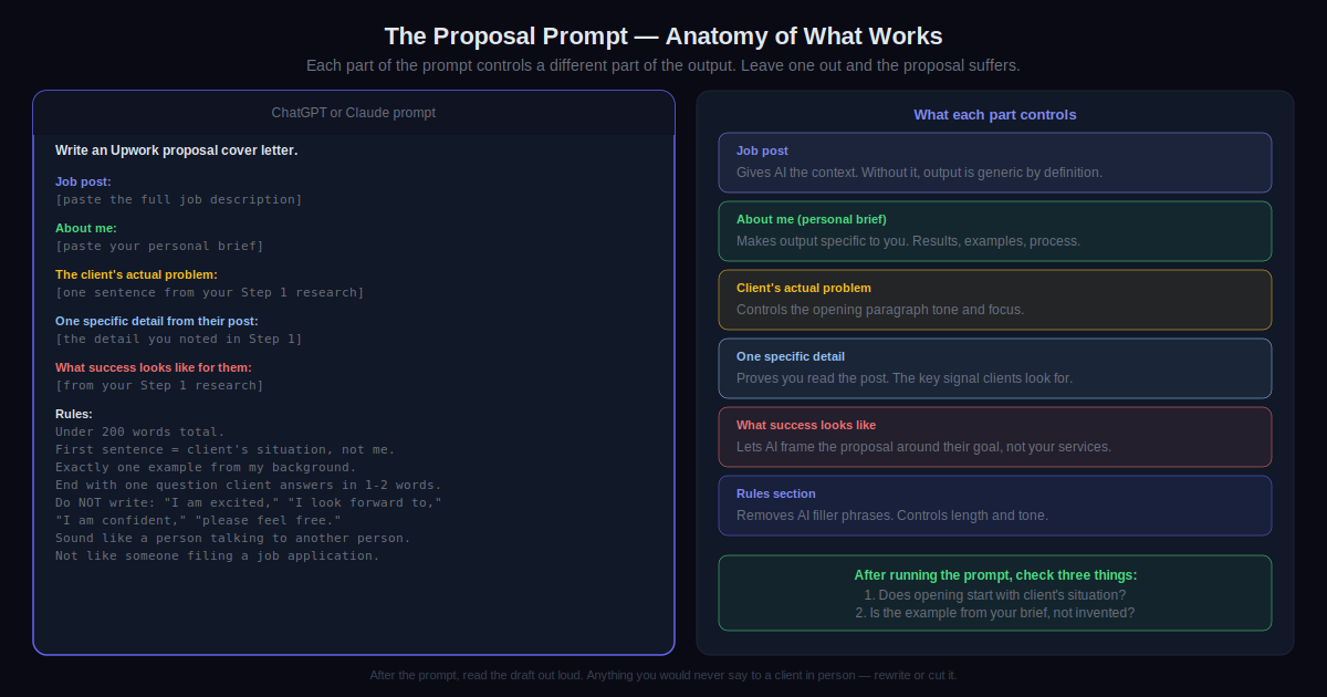 After that, find one job on Upwork that genuinely matches your skills. Do the five-minute research. Run the prompt. Edit it out loud. Send it.