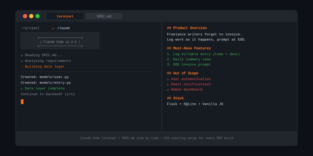 Be specific about “out of scope.” If you don’t tell Claude Code what to ignore, it will sometimes add features it thinks are helpful. User authentication, email notifications, admin panels — these are all things that will show up in your MVP if you don’t explicitly exclude them.