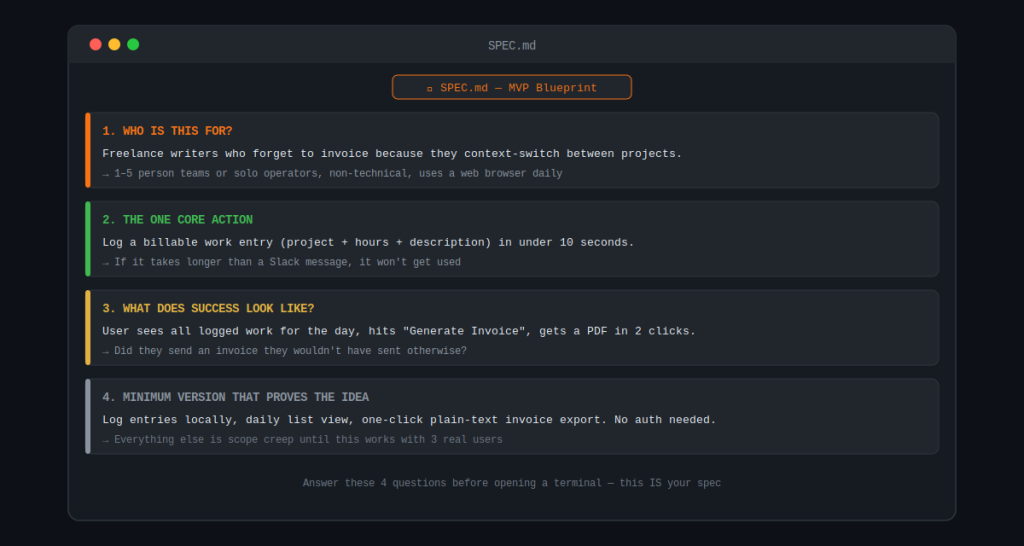 Open a text file and answer these four questions: Who is this for? What is the one thing they need to do? What does success look like after they do it? What’s the simplest version of this that proves the idea works? Your answers to these four questions are your spec. Everything else is scope creep waiting to happen.