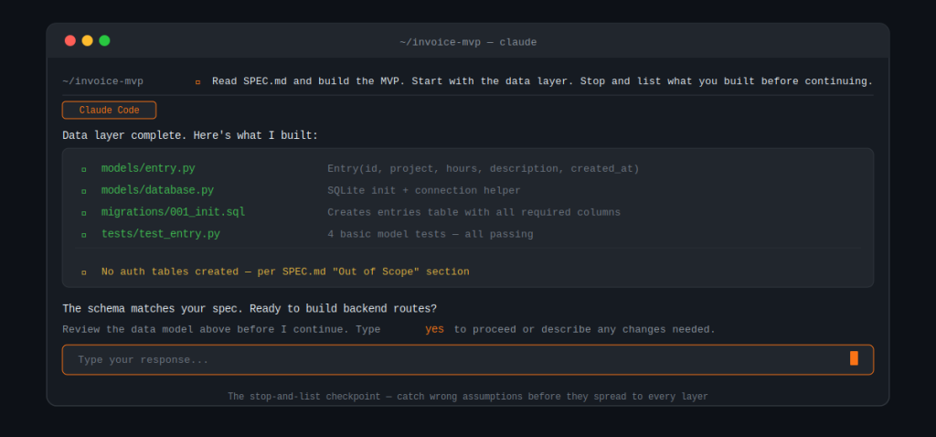 That stop-and-list instruction matters. It gives you checkpoints to review what was built before Claude Code moves on. Catching a wrong assumption at the data layer is a 5-minute fix. Catching it after the frontend is built means rework across every layer.