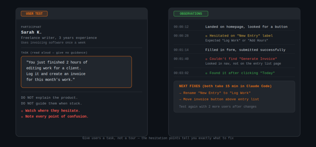 Find three to five people who match your target user profile. Don’t explain the product to them. Give them access and a single task: “Try to accomplish [core action] and tell me where you got confused or stuck.” Watch what they do. Don’t guide them. The places where they hesitate or fail are exactly where you need to iterate next.