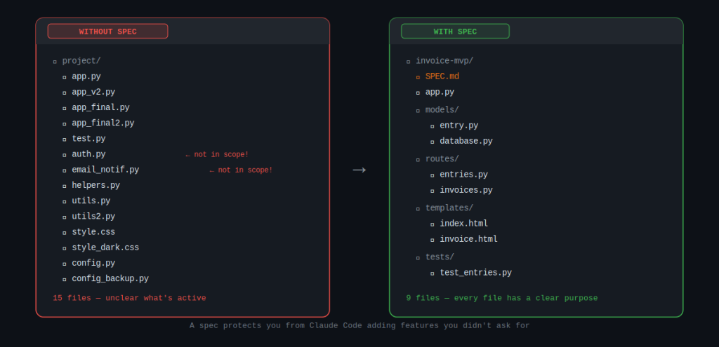 Claude Code performs best when you give it a structured spec file rather than a conversational prompt. There’s a real difference between “build me a web app that tracks billable hours” and handing it a document with defined features, data models, and acceptance criteria. The latter produces significantly better output on the first pass.
