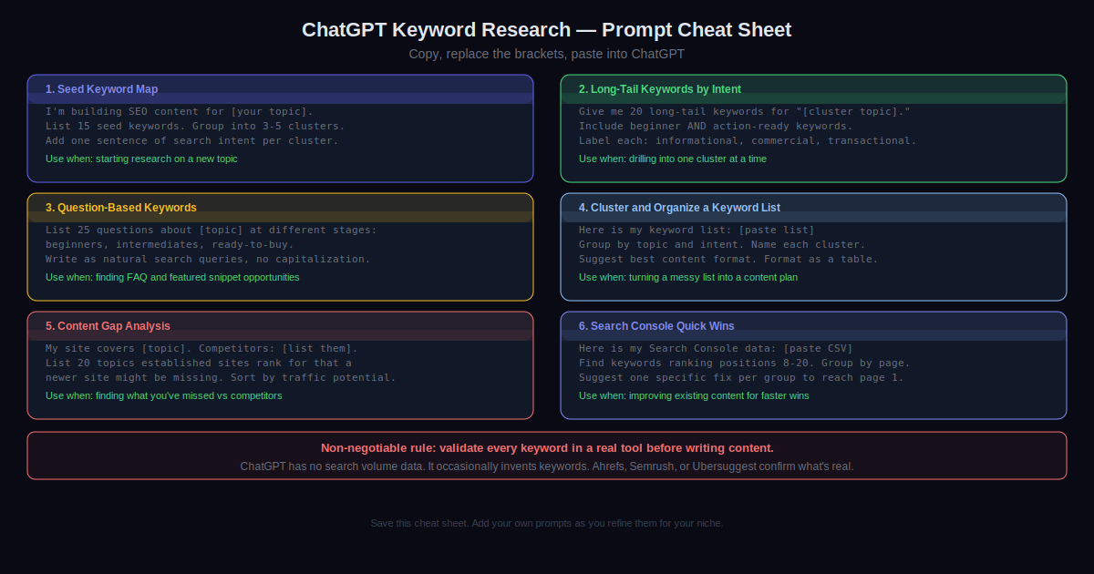 - One keyword validation tool. Ahrefs, Semrush, or free Ubersuggest. ChatGPT suggests. The tool confirms. You need both.
