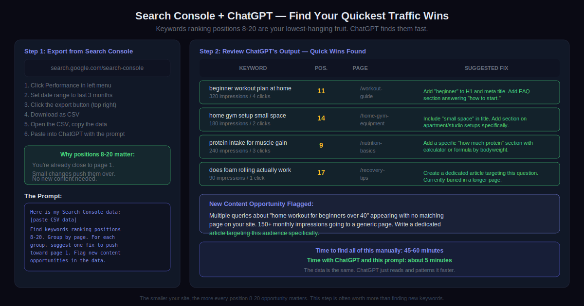 Positions 8 to 20. That’s where the money is for a site that already has some traction. You’re close to page one. A better title tag, fresher content, a few internal links added. That’s sometimes all it takes. ChatGPT can spot these patterns across a large data export faster than you can read through it manually.
