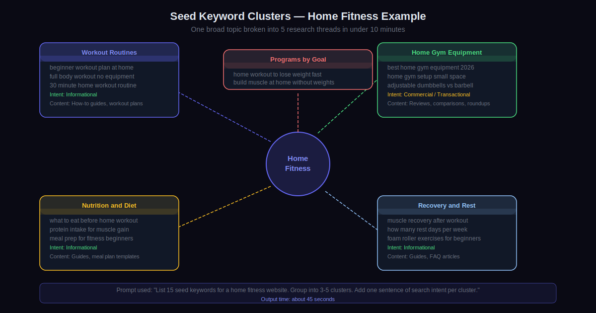 What comes back is a map, not a finished list. For a home fitness site you’d get clusters like “beginner workout routines,” “home gym equipment,” “nutrition basics,” “recovery and rest,” and “workout programs by goal.” Each one becomes its own research thread in the steps that follow.