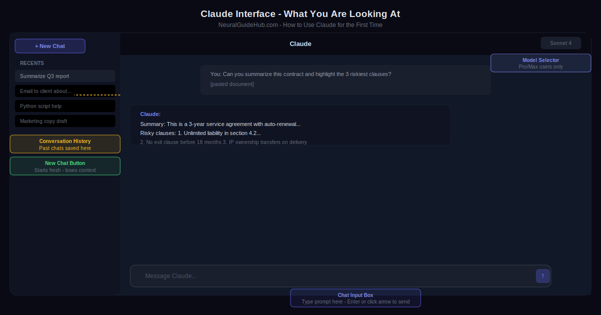 New Chat starts a blank conversation. Here’s the important part: Claude has no memory across conversations. Start a new chat and it has no idea what you talked about before. This catches people off guard constantly. If you’re working on something over multiple sessions, stay in the same thread.