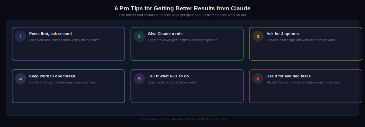 After that, the next things worth learning are how Projects work for ongoing contexts, how to attach files directly instead of pasting, and how Claude compares to ChatGPT and Perplexity for different types of work. Those guides are all on NeuralGuideHub when you’re ready.