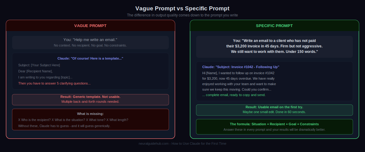 Same task. Completely different output. The second version tells Claude who’s reading it, what they need to get out of it, the deadline pressure, the length, and the tone. Claude takes all of that and works with it. Give it nothing to work with and it defaults to something generic.