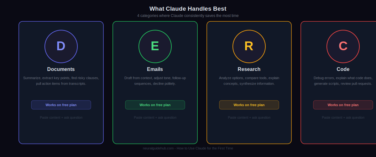 Four areas where Claude earns its place fast. Pick whichever matches the task you have waiting.